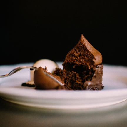 Homemade hazelnut gianduja gelato made with plant-based TCHO chocolate is the star of this decadent layered torte, served with slow-roasted cherries to add some bright acidity to the plate. Like gianduja, black rice flour also hails from the Piedmont region of Italy, and creates the deep midnight black layer cake and wafer cookie crust that round out this entirely plant-based, gluten free dessert, following TCHO’s lead to help the planet.
